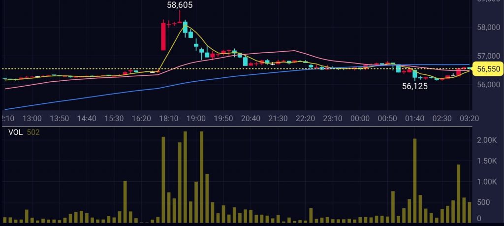 先週末、日本の市場の終了後に、CME日経平均先物が、一時、58,620.00円の高値を付けて終値が56,445.00円だったので、今日の日経平均現物は、CME日経平均先物に大きく寄せたというか、もてあそばれたようです。もしかすると、CME日経平均先物は、前祝だったのでしょうか。先週の日経平均現物と比べると、CME日経平均先物は、週末に、一時的に4,400円程度上げていたことになるから、びっくりでした。