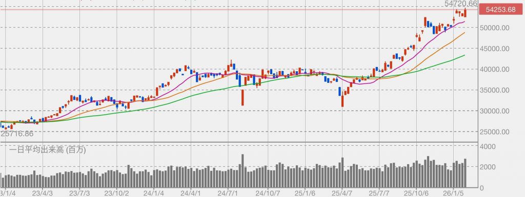 2026年2月9日(月)の日経平均は、プラス2,110.26円(プラス3.89%)と高騰して終値は56,363.94円。ザラ場では、57,337.07円の高値を付け、多くの銘柄が高騰したお祭り相場でした。